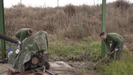 Azada en mano para salvar el motor de riego del agua y los ratones