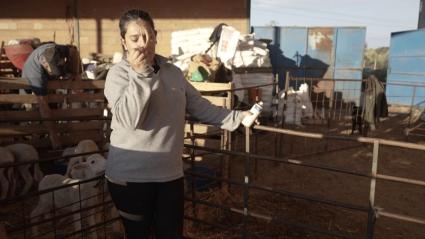 Chabeli y Antonio alimentan a la piara de ovejas paridas con una bola de ensilado