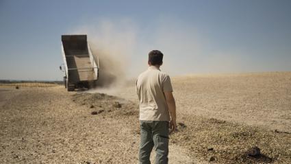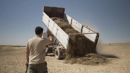 Marcos y Javier intercambian las peladuras de las almendras por estiércol