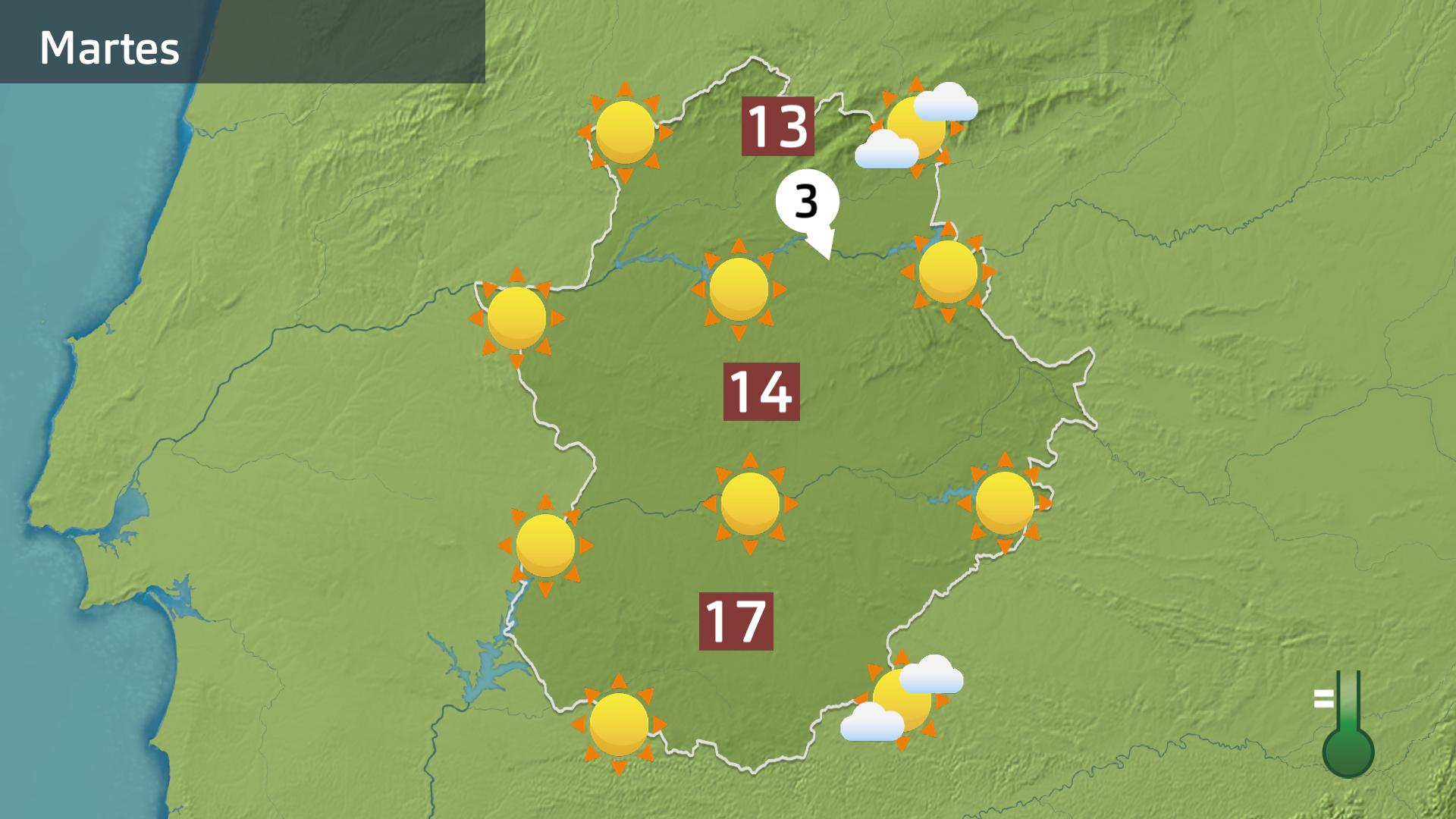 Y todo decíamos en un día que será soleado, la mañana aún nos deja algunas nubes bajas por el tercio sur y el sureste y bastantes nubes también enganchadas en zonas de vertiente norte sobre todo en las sierras del norte de Extremadura.