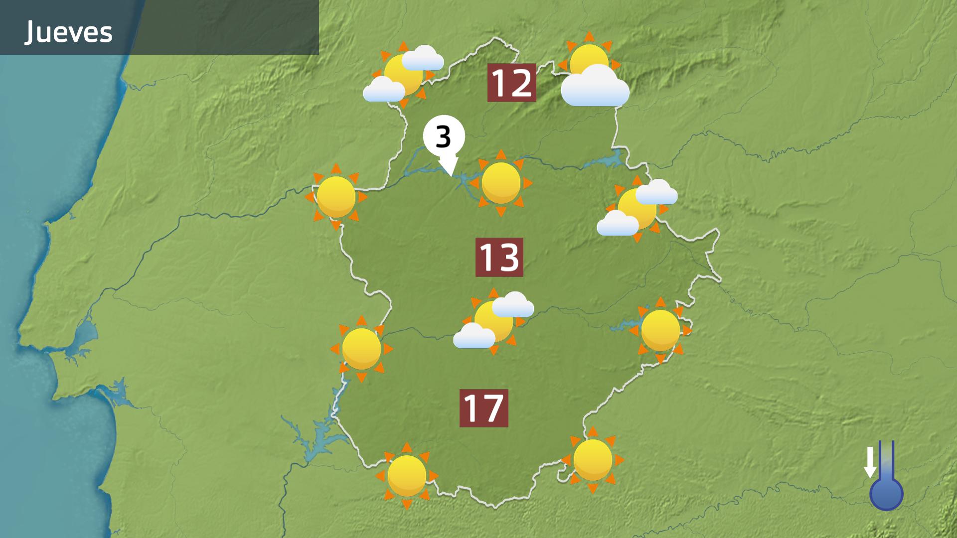 Una tendencia a la baja en los termómetros que se repetirá también en las máximas que en cualquier caso todavía esta tarde rondarán o pasarán de los 15-16 o incluso de los 17 grados en la mitad sur de Extremadura pero que apenas van a superar los 13-15 en las comarcas de la mitad norte.