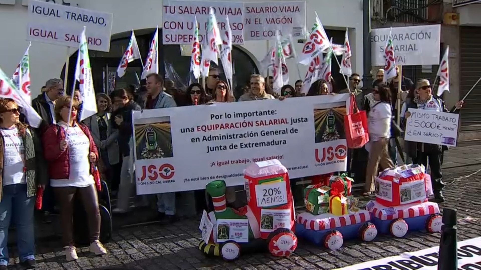 Durante la jornada, unas 70 personas se han concentrado frente a la sede de Presidencia en Mérida para exigir “el mismo salario para la misma categoría profesional”. Luis Manuel Gil, secretario general de USO, ha puesto como ejemplo que un administrativo de la Junta cobra 6.000 euros menos al año que otro con idénticas funciones en las diputaciones provinciales.