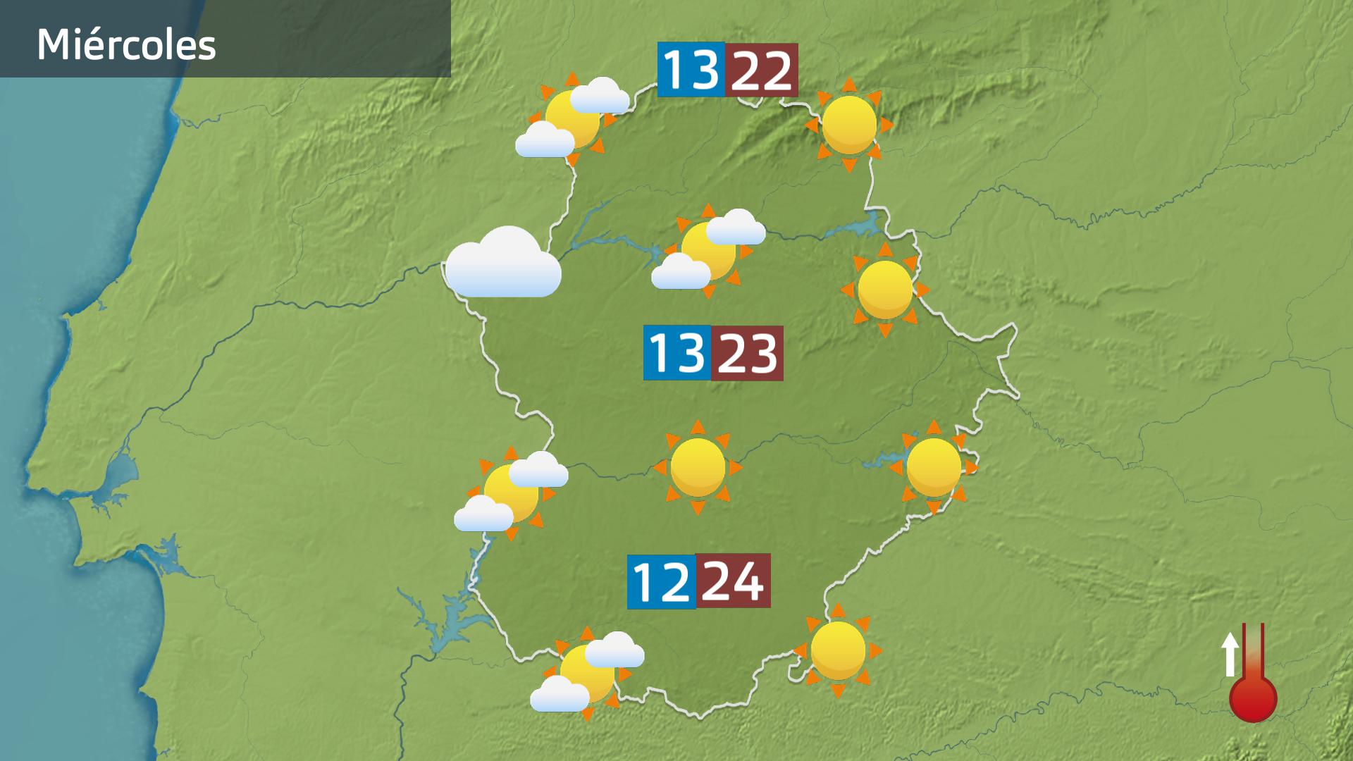 El miércoles llega con nubes bajas y nieblas que aparecerán sobre todo en el Tajo y el Guadiana. Las del Tajo Internacional sí aguantarán un poco mas durante la mañana. El resto de nubes irán desapareciendo y por la tarde las que veremos serán de tipo alto. Tiempo tranquilo en toda Extremadura que irá acompañado de temperaturas máximas altas porque superarán los 22 ºC en buena parte de Extremadura. Las mínimas ligeramente más bajas que la noche anterior.