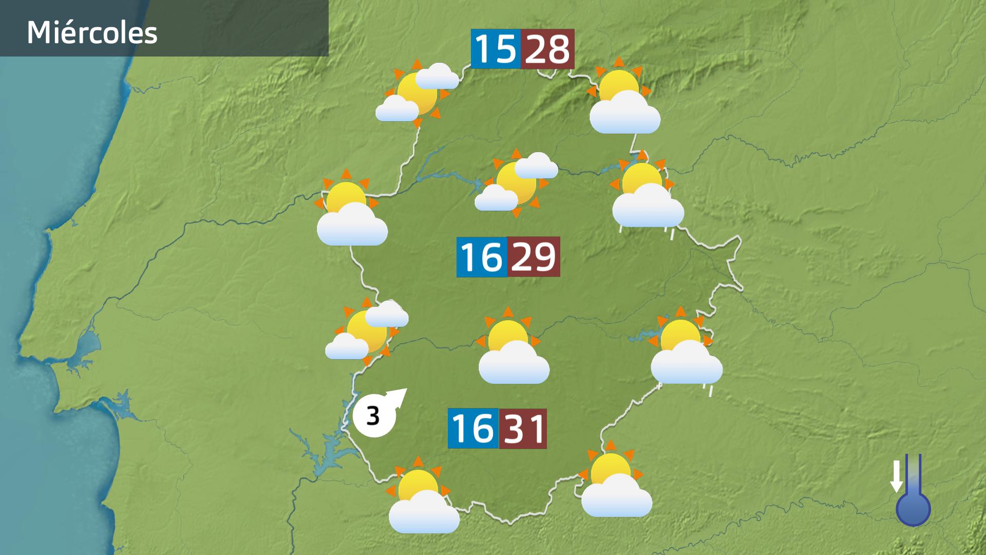 Además, el viento irá a más por la tarde hacia el suroeste de la región. Rachas más destacables en esas comarcas cambiando de dirección con respecto a días atrás y soplando del suroeste. En cuanto a las temperaturas, descenderán entre 1 y 3 grados en las comarcas pacenses, quedándose sin cambios en el resto.