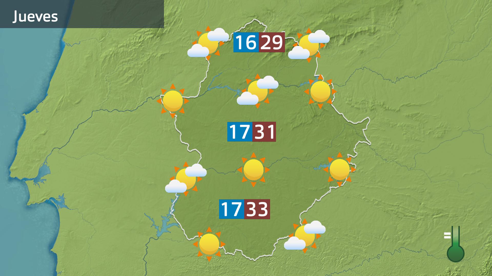 Así, el jueves comenzará con temperaturas mínimas que se moverán entre los 16-18ºC en numerosos municipios de la región, pero en fondos de valles es muy probable que bajen de los 15. Las máximas vespertinas serán muy parecidas a las de esta tarde, de nuevo en el intervalo de los 30-35ºC en la mayoría de los casos. En cuanto a los cielos, se colarán nubes de tipo alto. Serán más abundantes en la provincia cacereña, y más dispersas cuanto más al sur. El viento será del oeste, más intenso al atardecer.