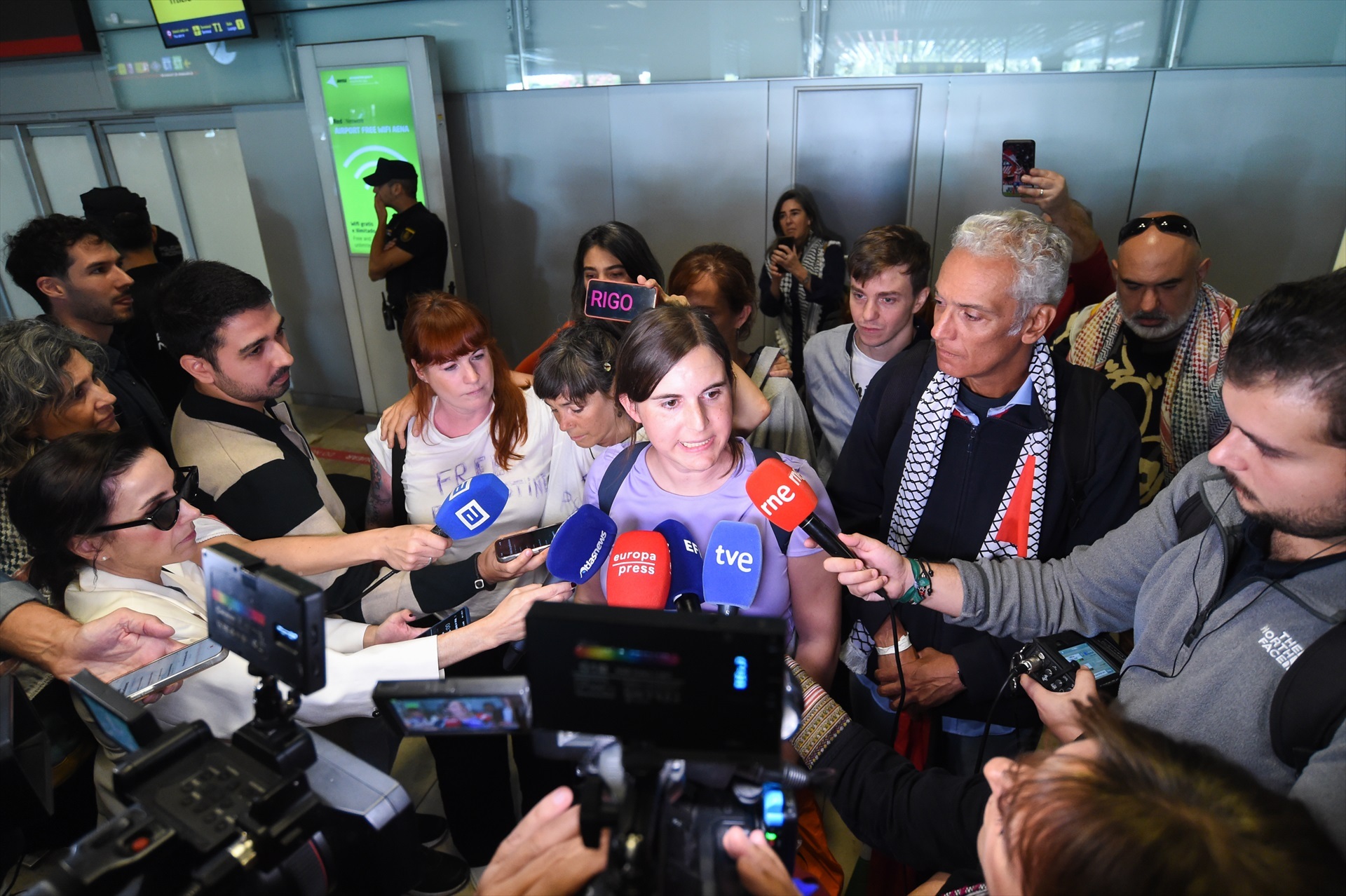 Manuela Bergerot, por su parte, se ha trasladado al aeropuerto para recibir a su compañera, "secuestrada junto a los demás tripulantes de la Flotilla que iban a romper el bloqueo humanitario al que tiene sometido el Gobierno de Netanyahu al pueblo palestino".