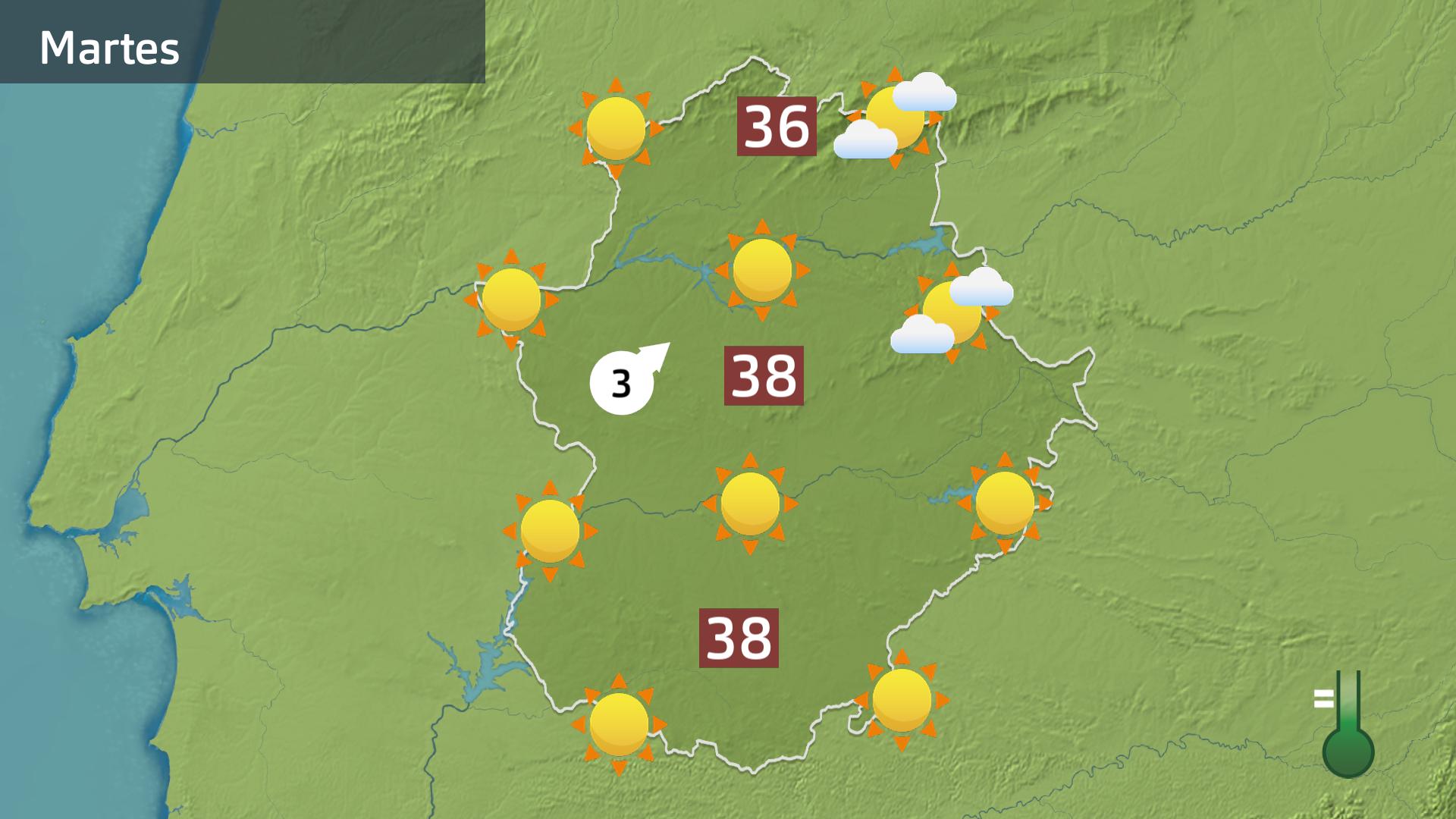 Las máximas que alcanzaremos esta tarde serán ligeramente más altas que las de ayer, sobre todo en las comarcas cacereñas donde se frenaron por las nubes por la tarde. Estaremos entre los 36 y 38 grados de forma generalizada, quedándose un poco más bajas en puntos de montaña. Puntualmente se alcanzarán los 39 ºC en el Campo Arañuelo y este de Badajoz.