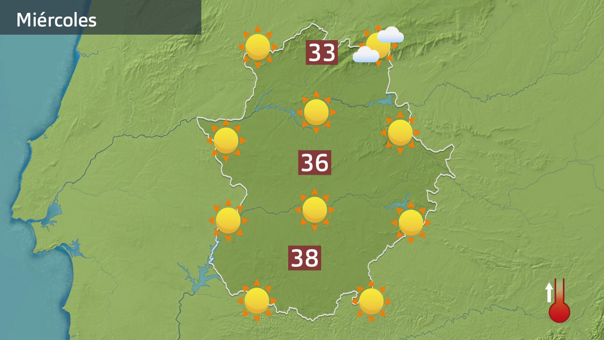 Y ojo porque los termómetros todavía mantendrán los ascensos al menos hasta el viernes y esta semana acabaremos por pasar de los 40 y hasta de los 42 grados por aquí. Máximas que activan de nuevo los avisos por altas temperaturas, avisos que hoy aparecen ya por las vegas del Guadiana, los Llanos de Olivenza, la Tierra de Barros, la Serena y la Siberia y en Villuercas y Montánchez (por donde pasaremos de los 36º9 que a partir de mañana acabarán por ser generales e incluso subirán a nivel naranja en algunas comarcas.