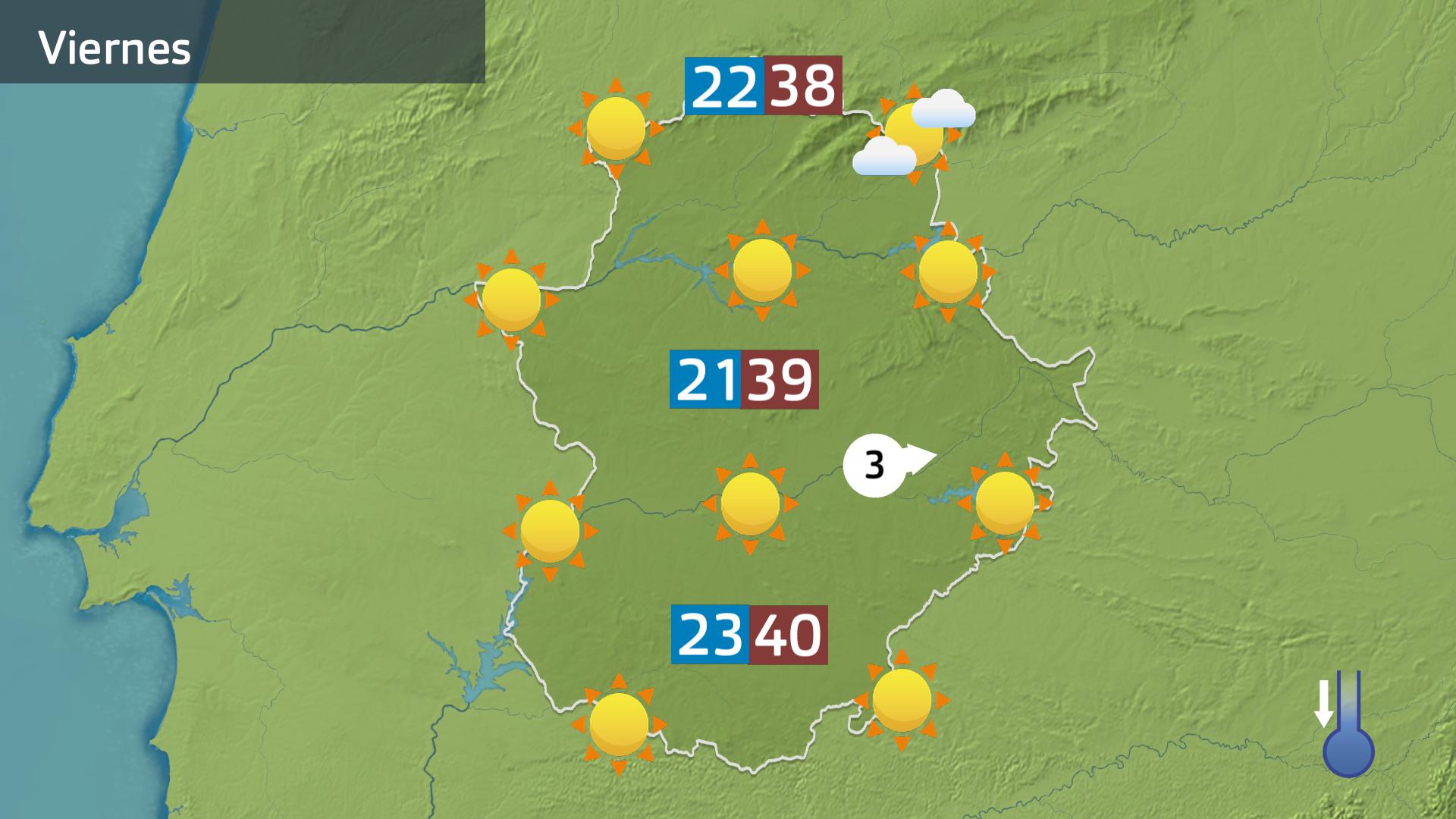 Empiezan a bajar por esas comarcas más occidentales, pero las máximas que alcanzaremos seguirán siendo muy altas. Las más altas estarán entre los 39 y 40 grados, que se registrarán en el ese de la provincia de Badajoz y cerca se quedarán hacia el Campo Arañuelo. Por la raya empezarán a descender pero en muchas poblaciones, las más bajas, seguirán por encima de los 37 ºC. Condiciones que hacen que los avisos se activen en toda la región, excepto en el sur de Badajoz.