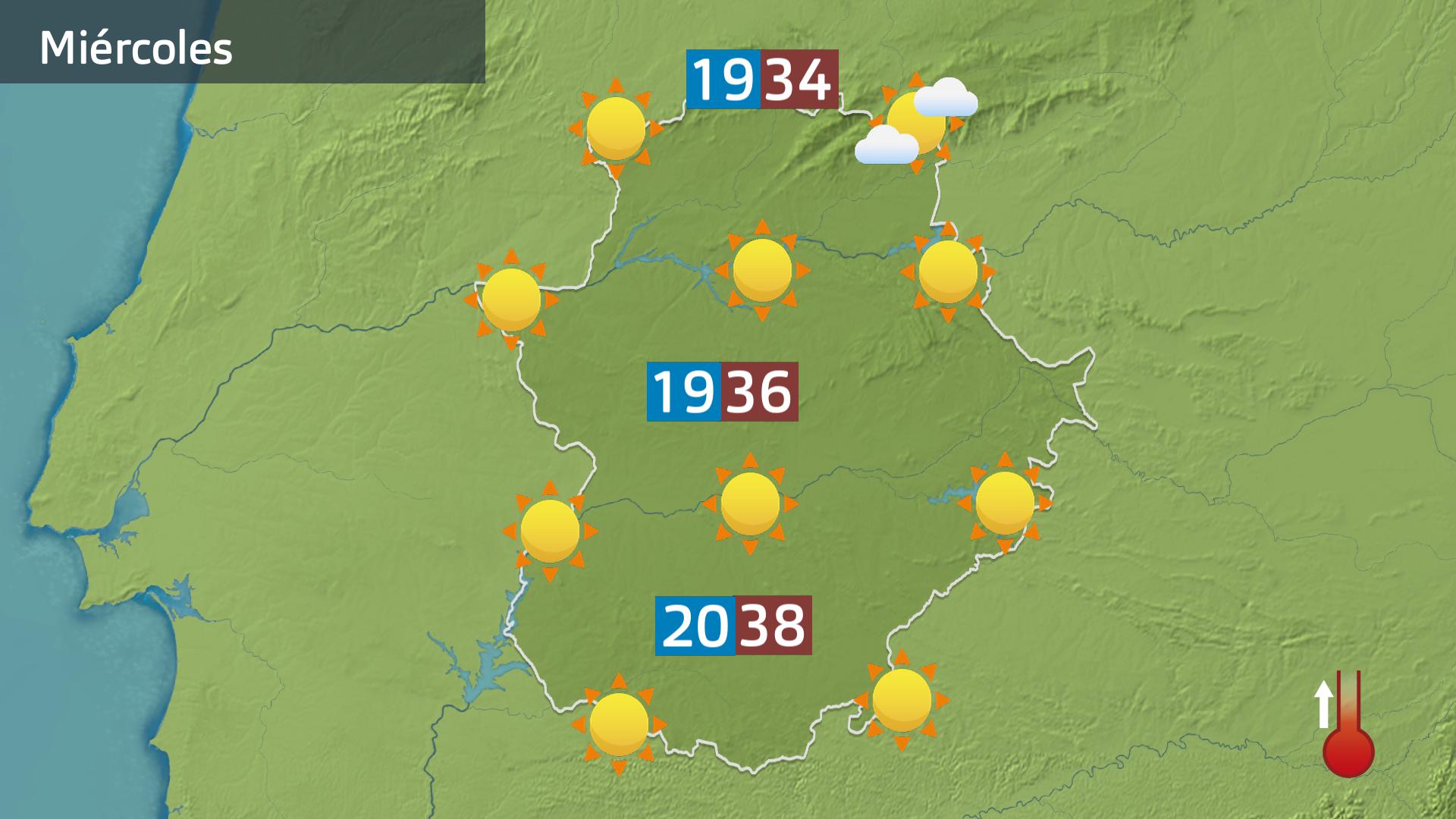 Tendremos entre 1 y 3 grados más que este martes, y eso equivale a que ya superaremos los 38 ºC en localidades del suroeste de la región. En el resto no serán tan altas pero sí pasaremos de los 35 grados en buena parte de Extremadura, con la excepción de las zonas de sierra.