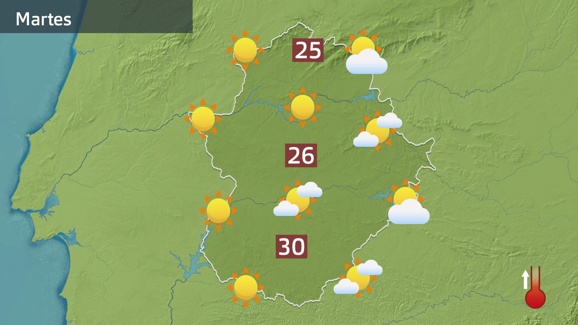 Una subida de los termómetros más bien discreta pero que nos dejará ya para esta tarde máximas alrededor o por encima de la raya de los 30 grados en algunas zonas del llano hacia el sur y el suroeste de Extremadura, por donde más notaremos hoy el ascenso de los termómetros.
