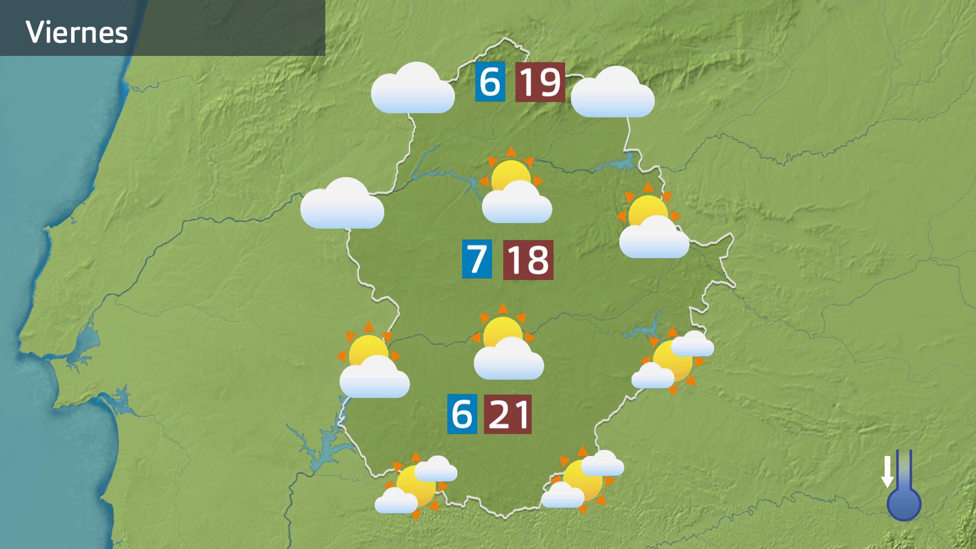 Así, la jornada del viernes comenzará con temperaturas mínimas por debajo de la marca de los 10ºC en amplias zonas de la región, e incluso inferiores a los 5 en fondos de valle del norte. Ambiente soleado en las primeras horas. Según avance la mañana la nubosidad irá en claro aumento y ya por la tarde contaremos con cielos cubiertos en el oeste cacereño, con lloviznas concentradas en las montañas. Serán menos probables en el resto. Bajan las temperaturas máximas, sobre todo en el norte.