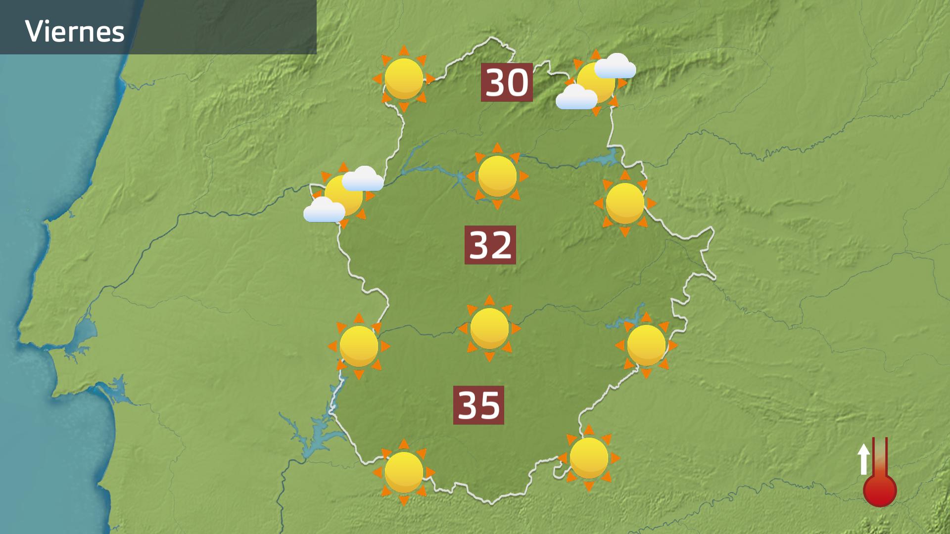 Esta tarde volverán a subir las temperaturas, sobre todo por la mitad sur y hablaremos ya de máximas para este viernes de más de 32-34 o puntualmente por encima de los 35 grados en prácticamente todo el llano e incluso, en algunas zonas bajas de la mitad sur, llegaremos a rondar o a pasar de la raya de los 36.