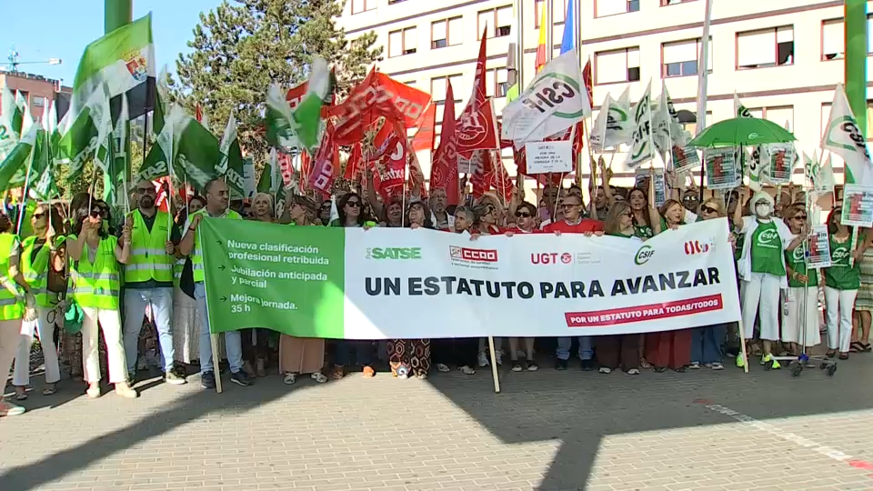 Las organizaciones sindicales presentes en el Ámbito de Negociación (Satse-FSES, FSS-CCOO, UGT, CSIF y CIG-Saúde) han amenazadocon "acciones contundentes" si el Ministerio de Sanidad y las comunidades autónomas deciden cerrar la negociación del Estatuto Marco, todo ello durante una multitudinaria concentración --con presencia de trabajadores extremeños-- frente a la sede del propio ministerio.