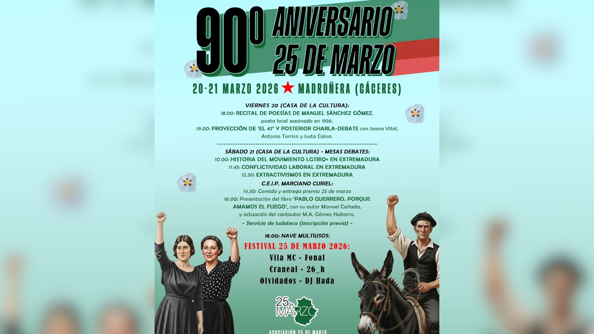 La Asociación 25 de marzo celebrará los días 20 y 21 de marzo en Madroñera el Día de Extremadura, coincidiendo en 2026 con el 90º aniversario de la gran ocupación pacífica de tierras de 1936. En este marco, se entregará el Premio 25 de marzo 2026 a tres figuras destacadas por su compromiso social y militante.