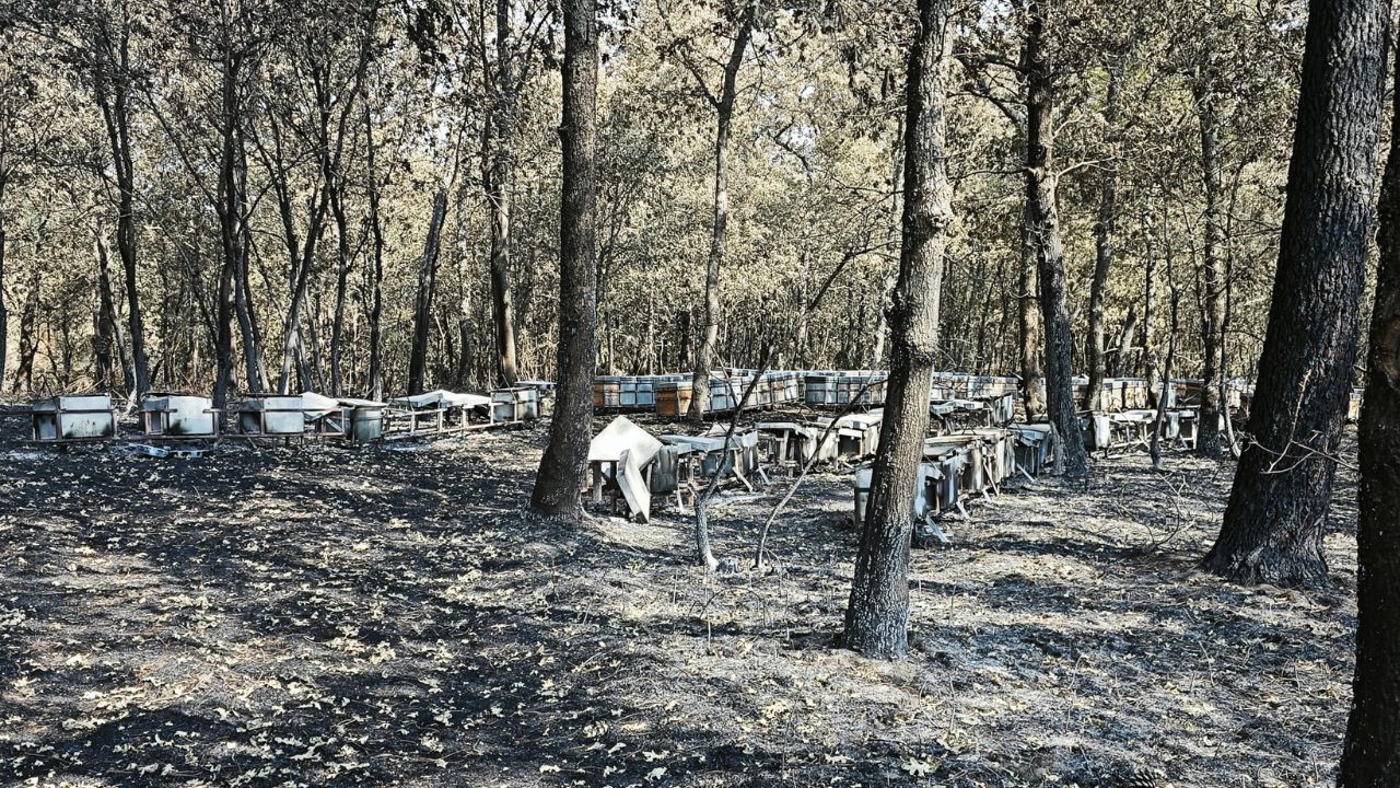 Es otra de las graves consecuencias de los incendios. Así quedaron completamente calcinadas estas colmenas tras el fuego que se originó en julio en Caminomorisco.Ventura Gil, presidente de APAEX, explica: “Se han quemado miles y miles de hectáreas tanto en Extremadura como en Castilla y León, que es donde los apicultores extremeños trashumamos en verano.”