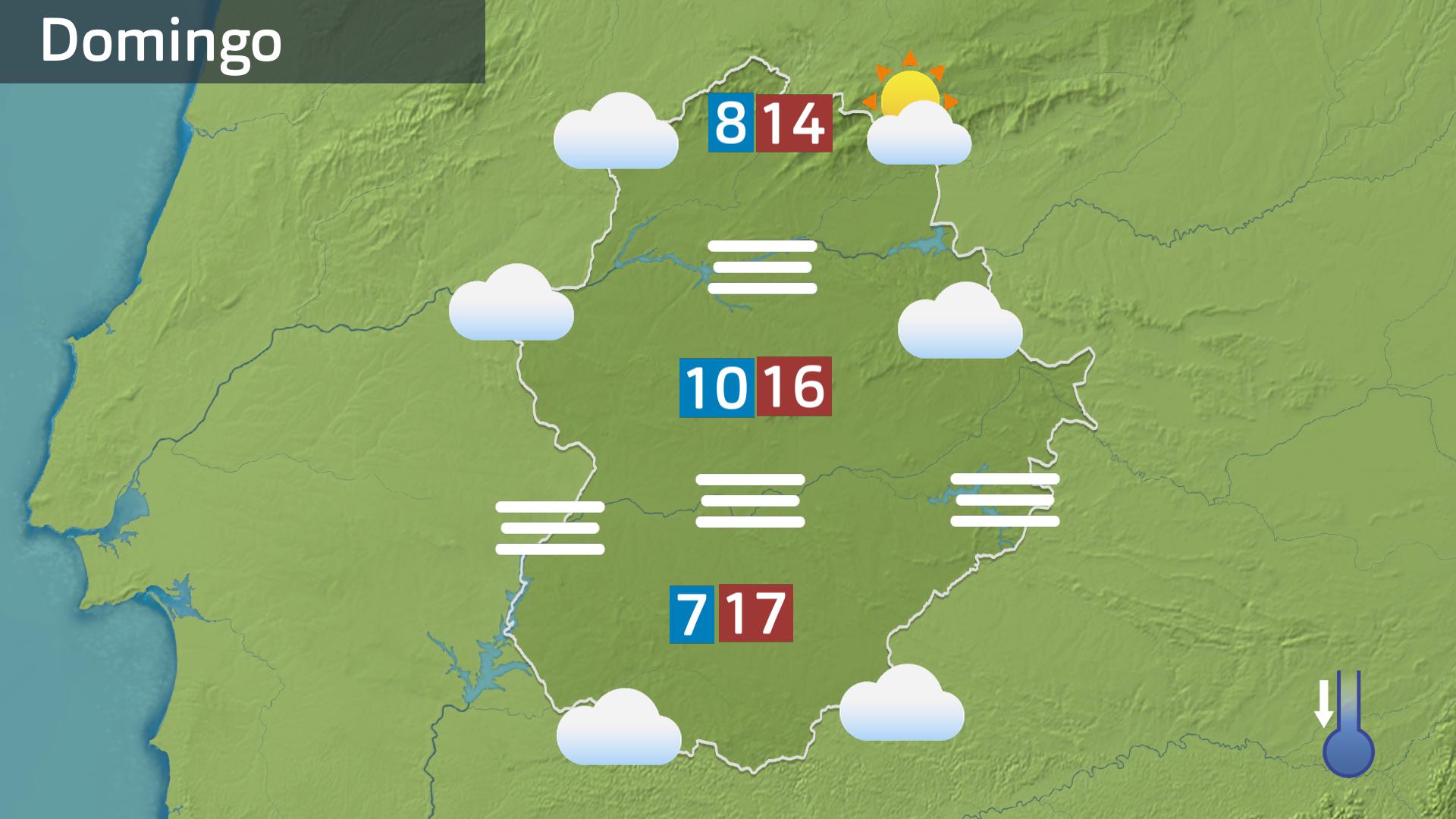 La jornada del domingo comenzará con brumas y bancos de niebla en las vegas del Tajo del Guadiana y con abundante nubosidad en el resto. La Aemet ha activados avisos en estas comarcas por este motivo. Según avance la mañana toda la nubosidad se irá fracturando, dejando paso a una segunda mitad del día marcada por los intervalos nubosos. Las mínimas descenderán, pero las máximas se mantendrán.