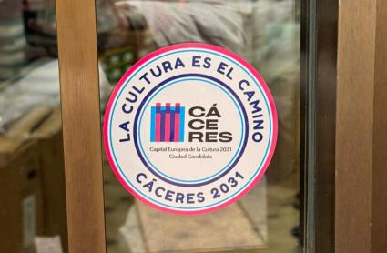 Pegatina en comercio en apoyo a Cáceres Capitalidad Europea de la Cultura