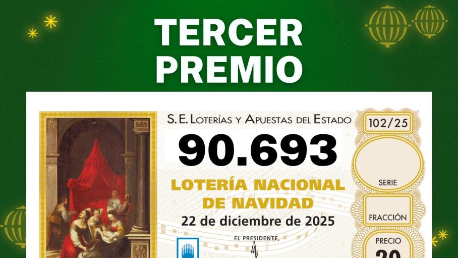 El número 90.693 ha sido agraciado con el tercer premio del Sorteo Extraordinario de la Lotería de Navidad, dotado con 500.000 euros por serie (50.000 euros al décimo). Extremadura ha vuelto a ser una de las grandes afortunadas de la mañana, con cinco localidades premiadas.
