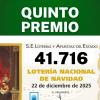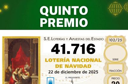 El número 41.716 ha sido agraciado con uno de los quintos premios del Sorteo Extraordinario de la Lotería de Navidad, dotado con 60.000 euros por serie (6.000 euros al décimo). El premio ha quedado muy repartido, con especial presencia en la Comunidad de Madrid, aunque también ha tocado en otras provincias del país.