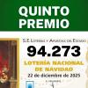El número 94.273 ha sido agraciado con uno de los quintos premios del Sorteo Extraordinario de la Lotería de Navidad, dotado con 60.000 euros por serie (6.000 euros al décimo). En esta ocasión, el premio ha quedado concentrado en Aragón y la Comunidad de Madrid, sin tocar Extremadura.