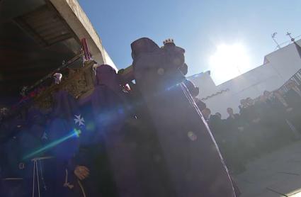En Mérida procesiona el Santo Entierro con el Cristo del Calvario y la Virgen de los Dolores, a la que acompaña la Banda de Música de Mérida. Cargan los pasos 80 portadores, un grupo de ellos subsaharianos usuarios del centro de acogida de migrantes de Mérida. A esta hora, la procesión ha entrado ya en carrera oficial.