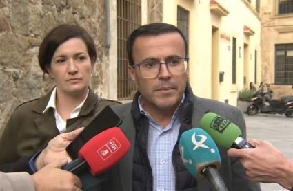 Miguel Ángel Gallardo, candidato del PSOE a la Presidencia de la Junta de Extremadura, atiende a los medios en Plasencia tras reunirse con representantes de PYMECON.