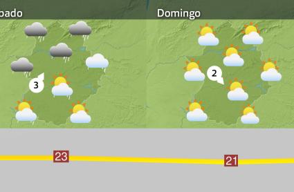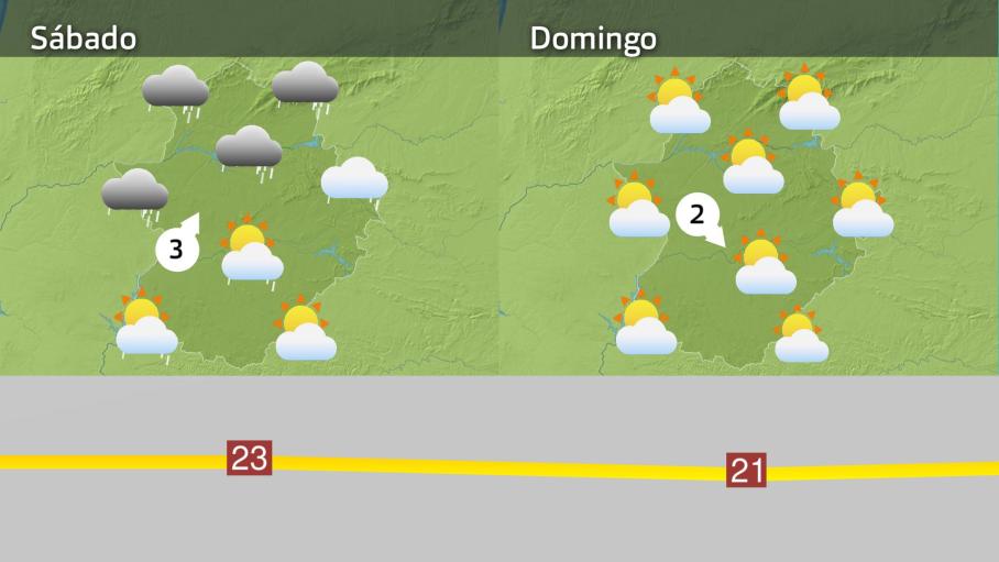 Ese frente seguirá dejando lluvias persistentes en zonas del Sistema Central, al norte de Cáceres, durante el sábado. Tendrán carácter moderado en general en esa zona, sobre todo hacia la parte más occidental. El frente avanzará e irá dejando lluvia débil e intermitente en otros puntos del centro de la región y al final del día más intermitentes aún en el sur. Además, el viento soplará del suroeste con racas de 30 km/h. El domingo cambia el viento al noroeste y descenderán las temperaturas entre 1 y 3 grados.