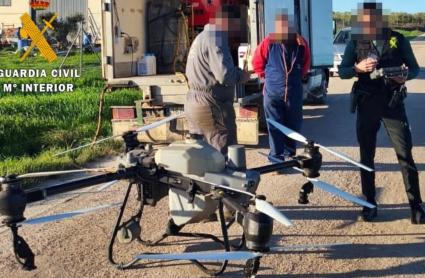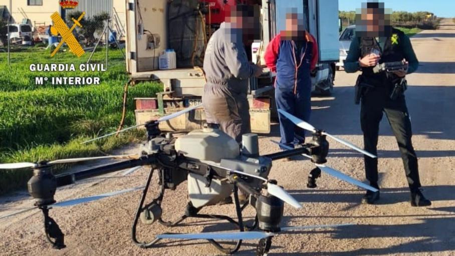 Agentes de la Guardia Civil instruyen expedientes sancionadores al piloto de un dron por sobrevolar la zona restringida del helipuerto del Hospital de Don Benito-Villanueva y por carecer de la autorización preceptiva de vuelo de este tipo de aeronaves no tripuladas mientras realizaba tareas de tratamiento de cultivos.