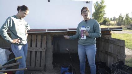 Isabel y Lidia limpian y desinfectan el corral de sus gallinas