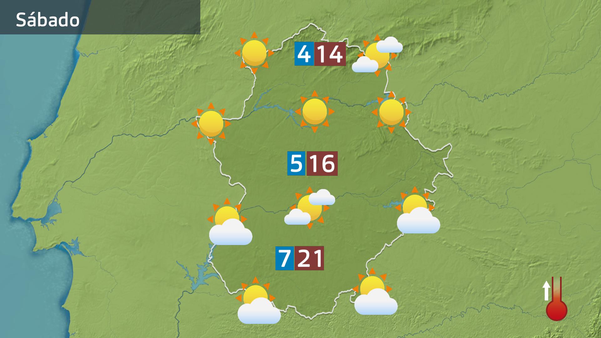 Así, la jornada del sábado comenzará con nubosidad de tipo bajo, sobre todo en la provincia pacense. También aparecerán algunas brumas en las vegas de los ríos. No parece que vayan a aguantar demasiado. El mediodía será más soleado pero irán llegando nubes altas por las comarcas del suroeste. Bajada de las mínimas, con registros, incluso, inferiores a los 5 en fondos de valle, y máximas lago más altas. El viento del noroeste cogerá fuerza a partir de media mañana.
