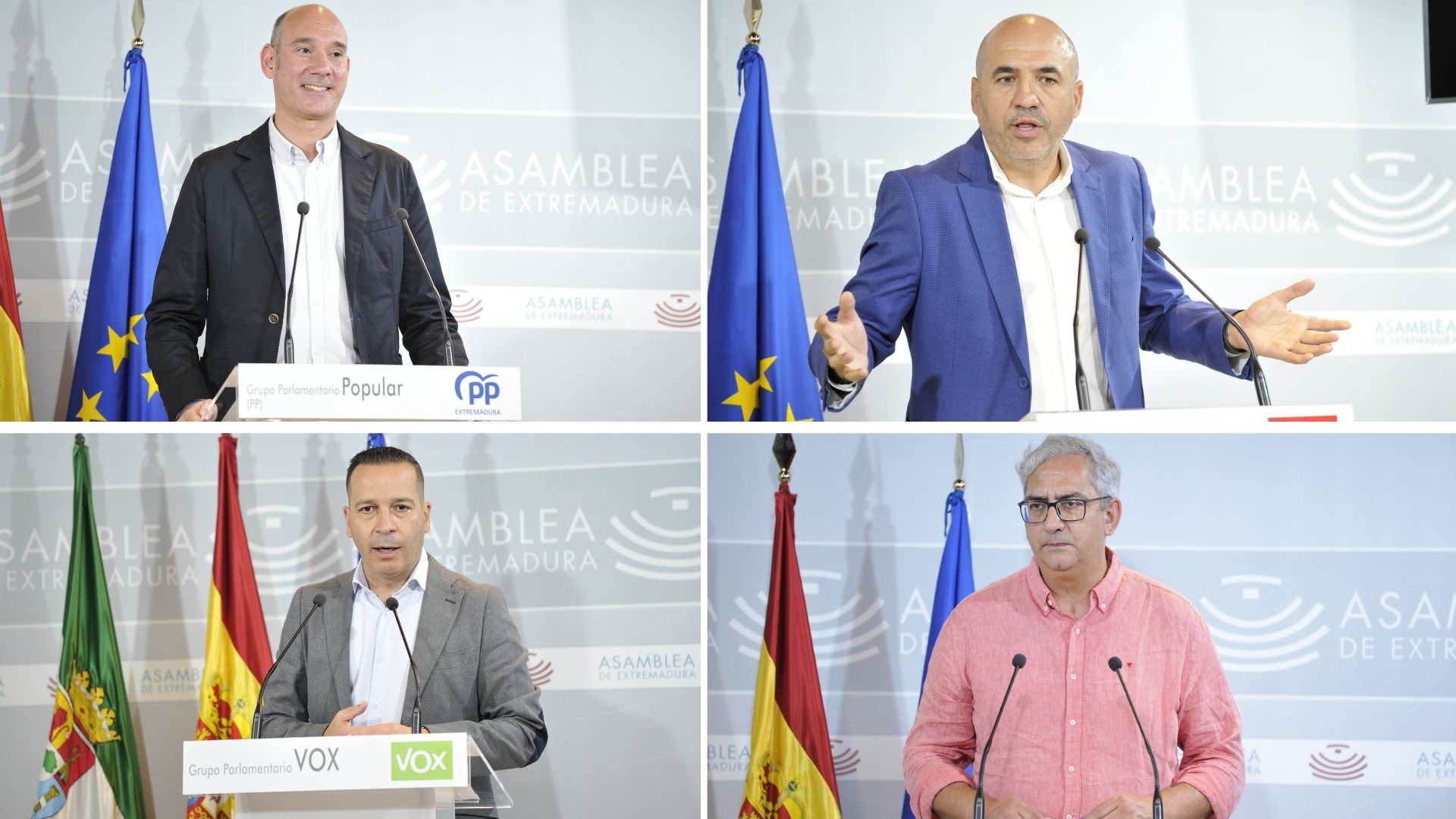 De izquierda a derecha y de arriba a abajo: el portavoz del Grupo Parlamentario Popular en la Asamblea, José Ángel Sánchez Juliá; el portavoz adjunto del Grupo Socialista, Juan Ramón Ferreira; portavoz del Grupo Parlamentario Vox, Óscar Fernández Calle; y el diputado de Unidas por Extremadura, Joaquín Macías.