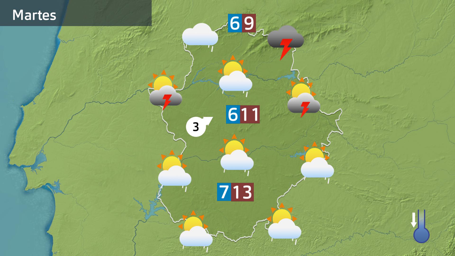 Chaparrones que serán tormentosos sobre todo en el centro y norte de la región. Al final del día volverán las lluvia desde el suroeste de manera más persistente. El viento entre flojo y moderado del suroeste en todas las comarcas.