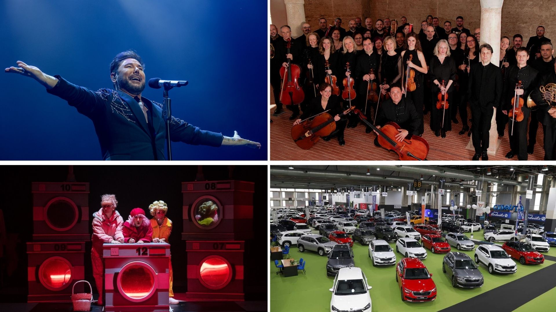 De izquierda a derecha y de arriba a abajo: Miguel Poveda, Orquesta de Extremadura, obra de teatro 'Caperucita en Manhattan' y Salón del automóvil en Ifeba.