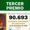 El número 90.693 ha sido agraciado con el tercer premio del Sorteo Extraordinario de la Lotería de Navidad, dotado con 500.000 euros por serie (50.000 euros al décimo). Extremadura ha vuelto a ser una de las grandes afortunadas de la mañana, con cinco localidades premiadas.