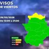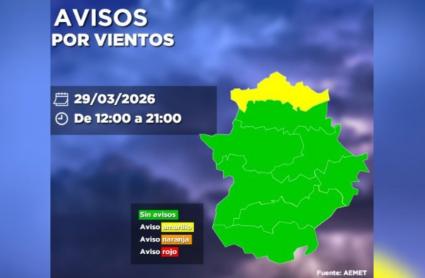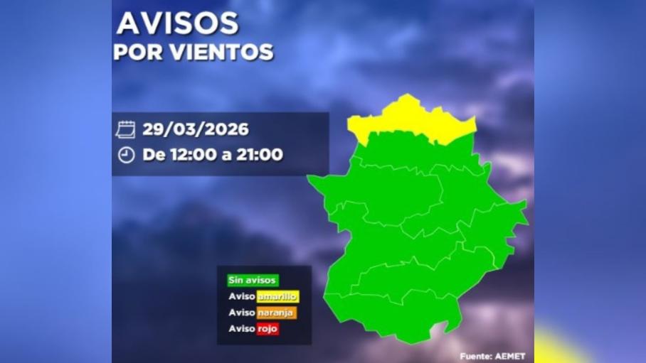 La AEMET y el Centro 112 Extremadura han activado la alerta amarilla por rachas de viento de hasta 70 km/h en el norte de la provincia de Cáceres, una situación que se mantendrá hasta las 21:00 horas de este domingo. El viento, de componente norte, afectará sobre todo a zonas a sotavento en la parte oriental. En el resto de la región, el tiempo permanecerá estable, con cielos poco nubosos y temperaturas que oscilarán entre 20 y 6 grados en Badajoz y 16 y 4 en Cáceres, acompañadas de viento flojo o moderado de componente noreste.