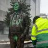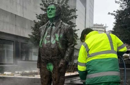 También la estatua de Miguel Celdrán necesitó limpieza: unos vándalos la pintaron con espray verde, en la que fue la gamberrada de la noche en la capital pacense.