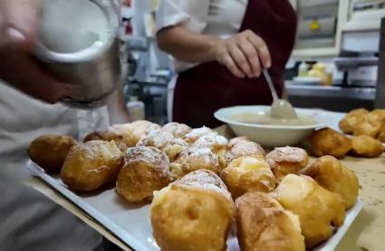 Los buñuelos, ese clásico que nunca pasa de moda, siguen siendo uno de los reyes de estas fechas. Tradicionalmente rellenos de crema o nata, hoy se presentan con nuevos sabores que amplían la oferta: praliné, caramelo, chocolate o cabello de ángel, como explica Juan Carlos Luna, de la Pastelería El Horno.