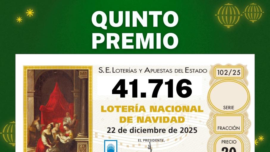 El número 41.716 ha sido agraciado con uno de los quintos premios del Sorteo Extraordinario de la Lotería de Navidad, dotado con 60.000 euros por serie (6.000 euros al décimo). El premio ha quedado muy repartido, con especial presencia en la Comunidad de Madrid, aunque también ha tocado en otras provincias del país.
