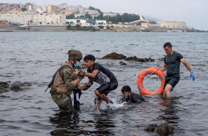 Un soldado del Ejército ayuda a dos migrantes a salir del agua en la playa de El Tarajal. La frontera entre España y Marruecos en la ciudad española de Ceuta