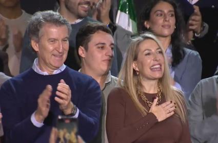 Alberto Núñez Feijóo y María Guardiola en el acto de precampaña en Lobón.
