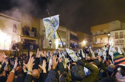 El Mayordomo porta el Estandarte de la Virgen, acompañado de otros jinetes a caballo, durante la fiesta de la Encamisá.
