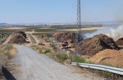 El fuego afecta a los montones de material acumulado en el exterior de la fábrica, a la espera de su transformación en energía. Se pueden contar cuatro o cinco focos, en varias islas de sarmientos o restos de podas, que son el combustible empleado en estas instalaciones.