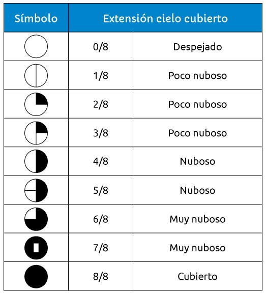 La cantidad de nubes en un lugar determinado es muy importante para un correcto diagnóstico meteorológico. Sobre todo antes de la aparición de los satélites. Esta información aparecía en los mapas sinópticos, aquellos que muestran las condiciones atmosféricas en un momento determinado, a través de unos círculos que se sombrean en mayor o en menor medida. Con cielo despejado aparece el círculo sin sombrear; y con cielo cubierto, totalmente negro. La rayita que lo acompaña indica la dirección del viento. Eso ya te lo contaré en otra ocasión.