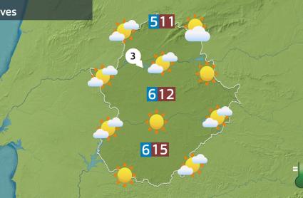 Esto se reflejará para este jueves en la previsión con menos nubosidad a lo largo de la jornada. Algo más se verá en el Sistema Central, así como en puntos del este de Badajoz y en la raya. Pero será un día tranquilo con sensación térmica de frío en aquellas zonas donde el viento del nordeste deje algunas rachas superiores a los 30 km/h: norte de Cáceres, los Llanos y en el centro y este de la región.