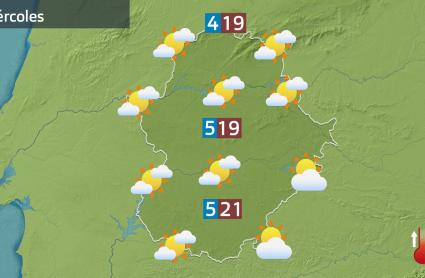La noticia será la subida de temperaturas en toda la región, pero obre todo en puntos del sureste. En general estaremos entre 4 y 6 grados más que hoy en lo referente a las máximas. Si hablamos de las mínimas se quedarán todavía sin cambios, pero sí se recuperarán en zonas altas del Sistema Central y Villuercas. Estaremos igualmente por debajo de los 7 ºC al amanecer.