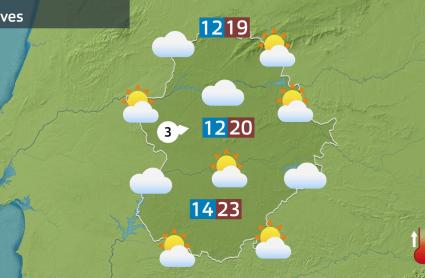 Notaremos a lo largo del día aumento de nubosidad, incluso algunas nieblas en los llanos, el Tajo y el Guadiana al empezar la mañana. Por la tarde las nubes serán cada vez más abundantes desde el oeste de la región, pero con baja probabilidad de precipitaciones. El viento soplará del oeste con rachas que podrán dejar 30 km/h en cualquier punto.