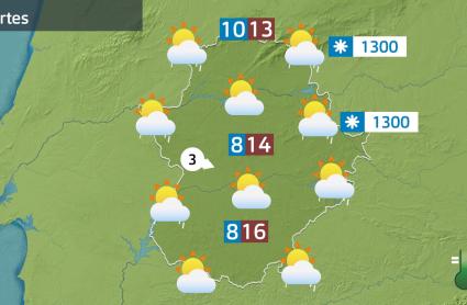 Al paso del frente entrará el viento del noroeste dejando sensación de temperatura baja, a pesar de que realmente los termómetros no tendrán registros más bajaos de los alcanzados hoy. Pero el aire frío si dejará la inestabilidad con esos chubascos y con nieve sobre todo en la mitad norte peninsular y Sistema Central. La cota de nieve estará en los 1300 metros por la tarde en el norte de Cáceres y Villuercas.