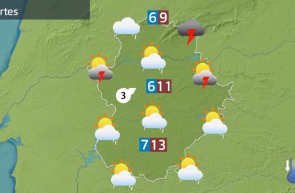 Chaparrones que serán tormentosos sobre todo en el centro y norte de la región. Al final del día volverán las lluvia desde el suroeste de manera más persistente. El viento entre flojo y moderado del suroeste en todas las comarcas.