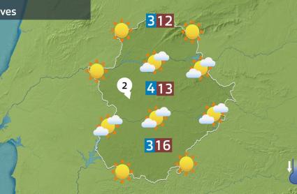 Este jueves tendremos otro ligero descenso térmico en las mínimas y en las máximas. Las mínimas sí se quedarán por debajo de los 5 ºC ya en toda Extremadura. Incluso rozarán la helada en poblaciones del norte y de las Villuercas e Ibores. Las máximas n pasarán mañana de los 16 ºC, que se alcanzarán en poblaciones del Guadiana. Por debajo de los 11 ºC en localidades más elevadas de sierra.